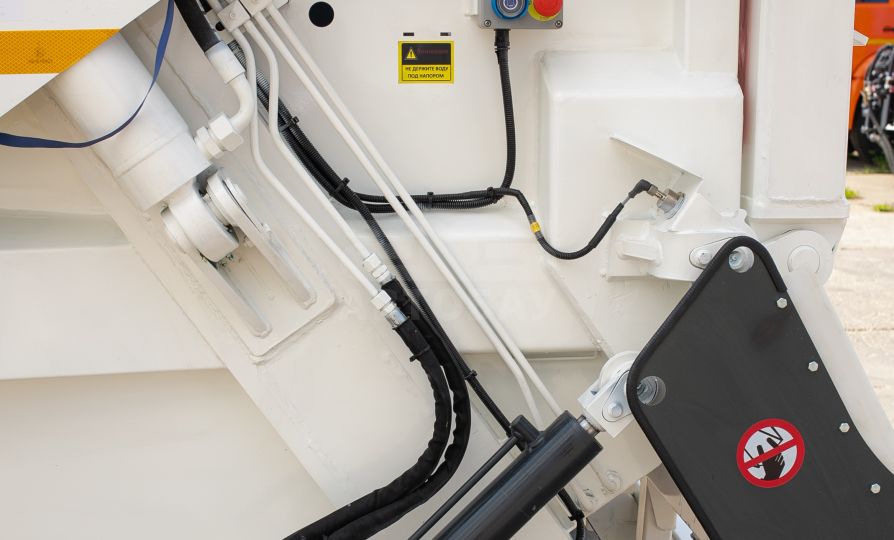Мусоровоз имеет прессующую плиту, изготовленную из высокопрочной стали, выполняющую функцию забора и прессования отходов из загрузочного бункера в основной (приводится в действие четырьмя гидроцилиндрами), и выталкивающую плиту, которая выполняет функцию обратной нажимной пластины и позволяет производить процесс подпрессовки. В зависимости от плотности отходов, коэффициент уплотнения может увеличиваться до 1:6.